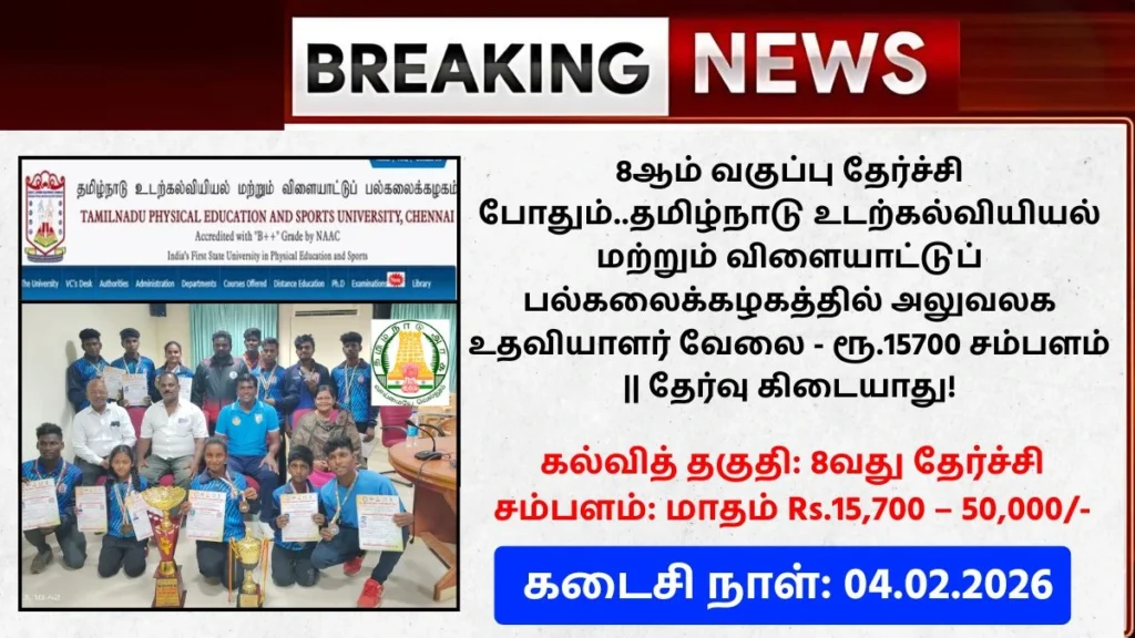 8ஆம் வகுப்பு தேர்ச்சி போதும்..தமிழ்நாடு உடற்கல்வியியல் மற்றும் விளையாட்டுப் பல்கலைக்கழகத்தில் அலுவலக உதவியாளர் வேலை – ரூ.15700 சம்பளம் || தேர்வு கிடையாது! TNPESU Recruitment 2026 Guna / January 6, 2026