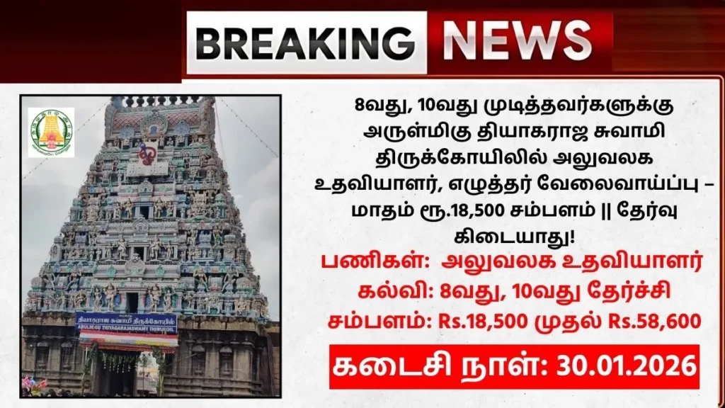 Arulmigu Thiyagaraja Swamy Temple Recruitment 2026: தமிழ்நாடு அரசு சென்னை – திருவொற்றியூர் அருள்மிகு தியாகராஜ சுவாமி திருக்கோயிலில் காலியாக உள்ள 10 இளநிலை உதவியாளர், வசூல் எழுத்தர், அலுவலக உதவியாளர், காவலர், வேதபாராயணம், உதவி சுயம்பாகம் பணியிடங்களை நிரப்புவதற்கான அறிவிப்பு வெளியிடப்பட்டுள்ளது. ஆர்வமும் தகுதியும் உள்ள விண்ணப்பதாரர்கள் 30.01.2026 தேதிக்குள் விண்ணப்பிக்குமாறு கேட்டுக்கொள்ளப்படுகிறார்கள். இந்த பணியிடங்களுக்கு யாரெல்லாம் விண்ணப்பிக்கலாம், தேவையான கல்வித் தகுதி என்ன, விண்ணப்பிப்பது எப்படி, மற்றும் வயது வரம்பு எவ்வளவு என்பது போன்ற விரிவான தகவல்களை பார்க்கலாம்.