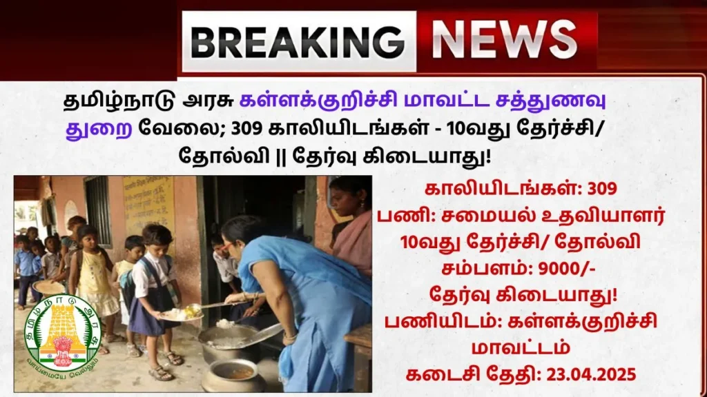தமிழ்நாடு அரசு கள்ளக்குறிச்சி மாவட்ட சத்துணவு துறை வேலை; 309 காலியிடங்கள் – 10வது தேர்ச்சி/ தோல்வி || தேர்வு கிடையாது! Kallakurichi Sathunavu Thurai Jobs 2025 Guna / April 16, 2025