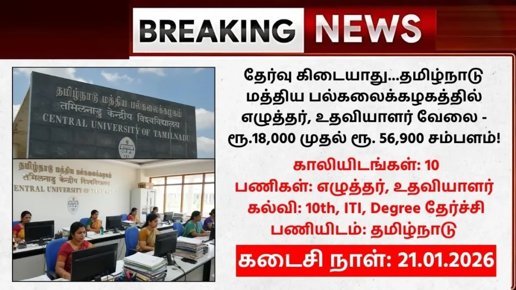 CUTN Recruitment 2026: தமிழ்நாடு மத்தியப் பல்கலைக்கழகத்தில் (Central University of Tamil Nadu – CUTN) காலியாக உள்ள 13 Personal Assistant, Senior Technical Assistant (Computer), Semi Professional Assistant, Upper Division Clerk, Laboratory Assistant, Lower Division Clerk, Hindi Typist மற்றும் Multi-Tasking Staff ஆகிய பணியிடங்களை நிரப்புவதற்கான அறிவிப்பு வெளியிடப்பட்டுள்ளது. எனவே ஆர்வமுள்ள விண்ணப்பதாரர்கள் 21.01.2026 தேதிக்குள் விண்ணப்பிக்குமாறு கேட்டுக் கொள்ளப்படுகிறார்கள். இந்த பணியிடங்களுக்கு யாரெல்லாம் விண்ணப்பிக்கலாம் கல்வி தகுதி என்ன?, விண்ணப்பிப்பது எப்படி? வயது வரம்பு எவ்வளவு? என்பது உள்ளிட்ட விவரங்களை பார்க்கலாம்.