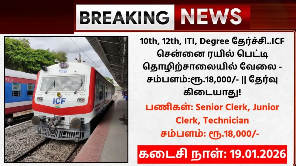 ICF Chennai Recruitment 2026: இந்திய ரயில்வேயின் கீழ் சென்னையில் இயங்கி வரும் ICF (Integral Coach Factory) ரயில் பெட்டி தொழிற்சாலையில், விளையாட்டு ஒதுக்கீட்டின் (Sports Quota) கீழ் காலியாக உள்ள பணியிடங்களை நிரப்புவதற்கான புதிய அறிவிப்பு வெளியாகியுள்ளது. இதன் மூலம் Senior Clerk (Level-5), Junior Clerk (Level-2), Technician Gr. III (Level-2) மற்றும் Technician (Level-1) ஆகிய பிரிவுகளில் மொத்தம் 25 பணியிடங்கள் நிரப்பப்பட உள்ளன. எனவே ஆர்வமுள்ள விண்ணப்பதாரர்கள் 19.01.2026 தேதிக்குள் விண்ணப்பிக்குமாறு கேட்டுக் கொள்ளப்படுகிறார்கள். இந்த பணியிடங்களுக்கு யாரெல்லாம் விண்ணப்பிக்கலாம் கல்வி தகுதி என்ன?, விண்ணப்பிப்பது எப்படி? வயது வரம்பு எவ்வளவு? என்பது உள்ளிட்ட விவரங்களை பார்க்கலாம்.