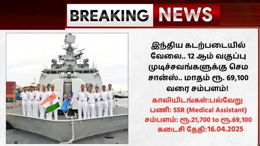 Indian Navy SSR Medical Assistant Recruitment 2025: இந்திய கடற்படையில் காலியாக உள்ள Sailors – SSR (Medical Assistant) பணியிடங்களை நிரப்புவதற்கான அதிகாரப்பூர்வ அறிவிப்பு வெளியிடப்பட்டுள்ளது. இப்பணியிடங்களுக்கு 12 ஆம் வகுப்பு தேர்ச்சி பெற்ற தகுதியான விண்ணப்பதாரர்கள் விண்ணப்பிக்கலாம். எனவே ஆர்வமுள்ள விண்ணப்பதாரர்கள் 16.04.2025 (கடைசி தேதி நீட்டிப்பு) தேதிக்குள் விண்ணப்பிக்குமாறு கேட்டுக் கொள்ளப்படுகிறார்கள். இப்பணியிடங்களுக்கு எப்படி விண்ணப்பிப்பது, வயது வரம்பு மற்றும் இதர தகுதிகள் என்னென்ன என்பது போன்ற முழுமையான விவரங்களை இங்கே காணலாம்.