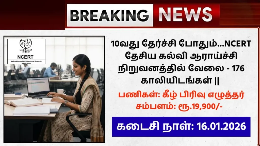 NCERT Recruitment 2026: NCERT – தேசிய கல்வி ஆராய்ச்சி மற்றும் பயிற்சி கவுன்சில் தற்போது காலியாகவுள்ள 176 Lower Division Clerk, Computer Operator Grade-III, Superintending Engineer, Production Officer, Business Manager, Assistant Production Officer, Assistant Engineer Grade-A, Assistant Public Relation Officer, Senior Accountant, Junior Hindi Translator, Junior Accountant, Store Officer, Production Assistant, Professional Assistant, Cameraman Grade-II, Engineering Assistant, Script Writer, Set Designer, Graphic Assistant Grade-I, Sr. Proof Reader (English), Technician Grade-I, Audio Radio Producer Grade-III, TV Producer Grade-III, Semi Professional Assistant, Store Keeper Grade-I, Floor Assistant, Film Assistant, Graphic Assistant Grade-II, Store Keeper Grade-II, Lab Assistant, Senior Library Attendant, Film Joiner, Lightman, Painter, Toucher Grade-II, Carpenter பணியிடங்களை நிரப்புவதற்கான புதிய அறிவிப்பை வெளியிட்டுள்ளது. இதற்கு விண்ணப்பிக்கத் தகுதியுள்ள நபர்களிடமிருந்து விண்ணப்பங்கள் வரவேற்கப்படுகின்றன. எனவே ஆர்வமுள்ள விண்ணப்பதாரர்கள் 16.01.2026 தேதிக்குள் விண்ணப்பிக்குமாறு கேட்டுக் கொள்ளப்படுகிறார்கள். இந்த பணியிடங்களுக்கு யாரெல்லாம் விண்ணப்பிக்கலாம் கல்வி தகுதி என்ன?, விண்ணப்பிப்பது எப்படி? வயது வரம்பு எவ்வளவு? என்பது உள்ளிட்ட விவரங்களை பார்க்கலாம்.
