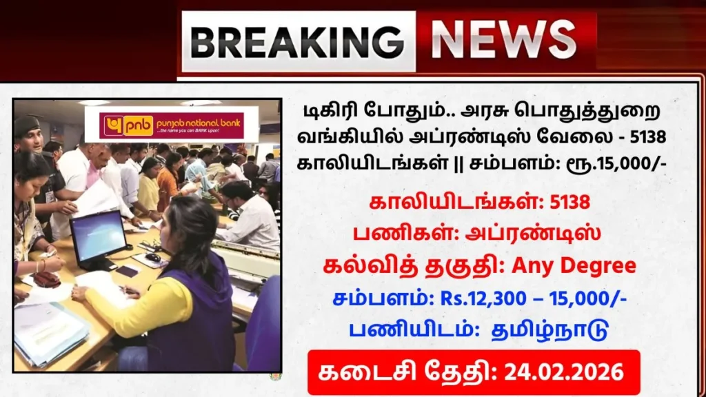 PNB Apprentice Recruitment 2026: நாட்டின் 3வது பெரிய பொதுத்துறை வங்கியான பஞ்சாப் தேசிய வங்கியில் (PNB) காலியாக உள்ள 5,138 Apprentice (அப்ரண்டிஸ்) பணியிடங்களை நிரப்புவதற்கான அதிகாரப்பூர்வ அறிவிப்பு வெளியிடப்பட்டுள்ளது. குறிப்பாகத் தமிழ்நாட்டில் மட்டும் 121 பணியிடங்கள் ஒதுக்கப்பட்டுள்ளன. தகுதியுள்ள நபர்கள் 24.02.2026 அன்றோ அல்லது அதற்கு முன்னதாகவோ விண்ணப்பிக்குமாறு கேட்டுக் கொள்ளப்படுகிறார்கள்.. இந்த பணியிடங்களுக்கு யாரெல்லாம் விண்ணப்பிக்கலாம் கல்வி தகுதி என்ன?, விண்ணப்பிப்பது எப்படி? வயது வரம்பு எவ்வளவு? என்பது உள்ளிட்ட விவரங்களை பார்க்கலாம்.