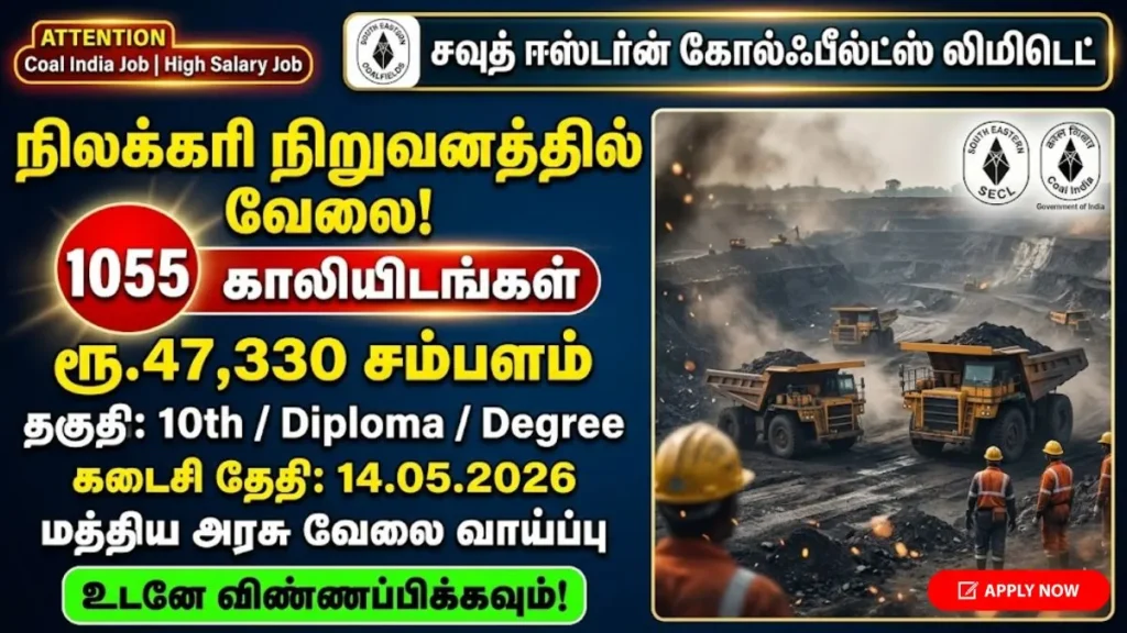 SECL Recruitment 2026: இந்தியாவில் மிகப்பெரிய நிலக்கரி உற்பத்தி நிறுவனமான South Eastern Coalfields Limited (SECL), 2026-ஆம் ஆண்டிற்கான பிரம்மாண்ட வேலைவாய்ப்பு அறிவிப்பை வெளியிட்டுள்ளது. இந்த புதிய அறிவிப்பின்படி, சுரங்கத் துறையில் Mining Sirdar, Assistant Foreman மற்றும் Dy. Surveyor ஆகிய முக்கியப் பதவிகளில் மொத்தம் 1,055 காலியிடங்கள் நிரப்பப்பட உள்ளன. இப்பணிகளுக்கு விண்ணப்பிக்க விரும்புவோர் 10-ஆம் வகுப்பு முதல், சம்பந்தப்பட்ட துறைகளில் டிப்ளமோ அல்லது பட்டப்படிப்பு (Degree) தேர்ச்சி பெற்றிருக்க வேண்டும்.