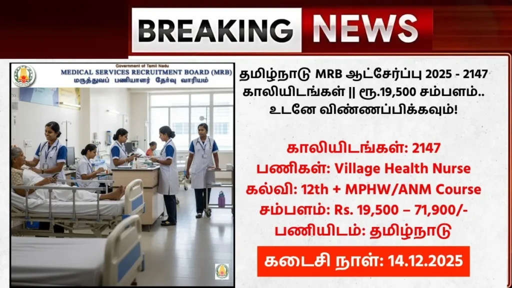 Tamilnadu MRB Recruitment 2025: தமிழ்நாடு மருத்துவப் பணியாளர் தேர்வு வாரியம் (TN MRB) ஒரு புதிய வேலைவாய்ப்பு அறிவிப்பை வெளியிட்டுள்ளது. அதன்படி, தற்போது காலியாக உள்ள 2147 கிராம சுகாதார செவிலியர் (Village Health Nurse) / துணை செவிலியர் (Auxiliary Nurse Midwife) பணியிடங்களை நிரப்புவதற்கான அறிவிப்பு வெளியாகியுள்ளது. எனவே, ஆர்வமும் தகுதியும் உள்ள விண்ணப்பதாரர்கள் 14.12.2025 தேதிக்குள் விண்ணப்பிக்குமாறு கேட்டுக் கொள்ளப்படுகிறார்கள். இந்தப் பணியிடங்களுக்கு யார் விண்ணப்பிக்கலாம், தேவையான கல்வித் தகுதி என்ன, எவ்வாறு விண்ணப்பிப்பது, வயது வரம்பு எவ்வளவு போன்ற முழுமையான விவரங்களை இப்போது பார்க்கலாம்.