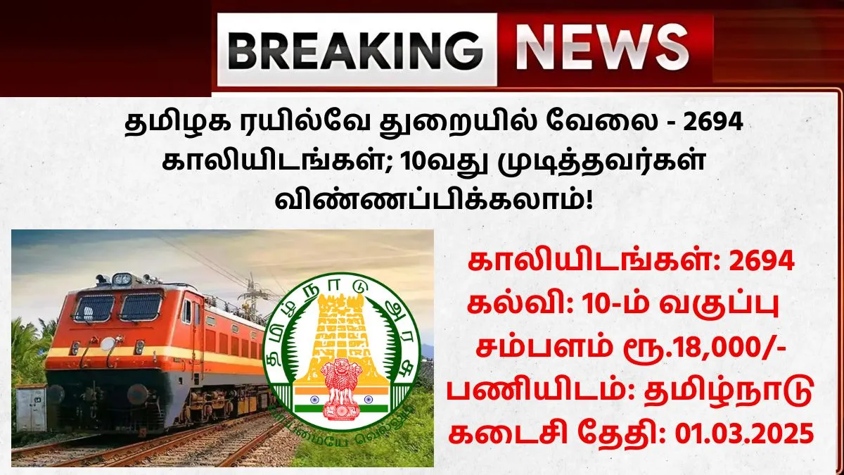 Tamilnadu Railway Recruitment 2025: ரயில்வே ஆட்சேர்ப்பு வாரியம் (RRB) நாடு முழுவதும் காலியாக உள்ள குரூப் டி பணிகளை நிரப்ப அறிவிப்பு வெளியிட்டுள்ளது. இந்தியா முழுவதும் 32438 காலியிடங்களும் தமிழ்நாட்டில் மட்டும் 2694 காலியிடங்கள் அறிவிக்கப்பட்டுள்ளது. எனவே ஆர்வமுள்ள விண்ணப்பதாரர்கள் 01.03.2025 (கடைசி தேதி நீட்டிப்பு) தேதிக்குள் விண்ணப்பிக்குமாறு கேட்டுக்கொள்ளப்படுகிறார்கள். இந்த பணியிடங்களுக்கு யார் விண்ணப்பிக்கலாம்? கல்வித் தகுதி என்ன? விண்ணப்பிப்பது எப்படி? வயது வரம்பு எவ்வளவு? என்பது உள்ளிட்ட விவரங்களை பார்க்கலாம்.
