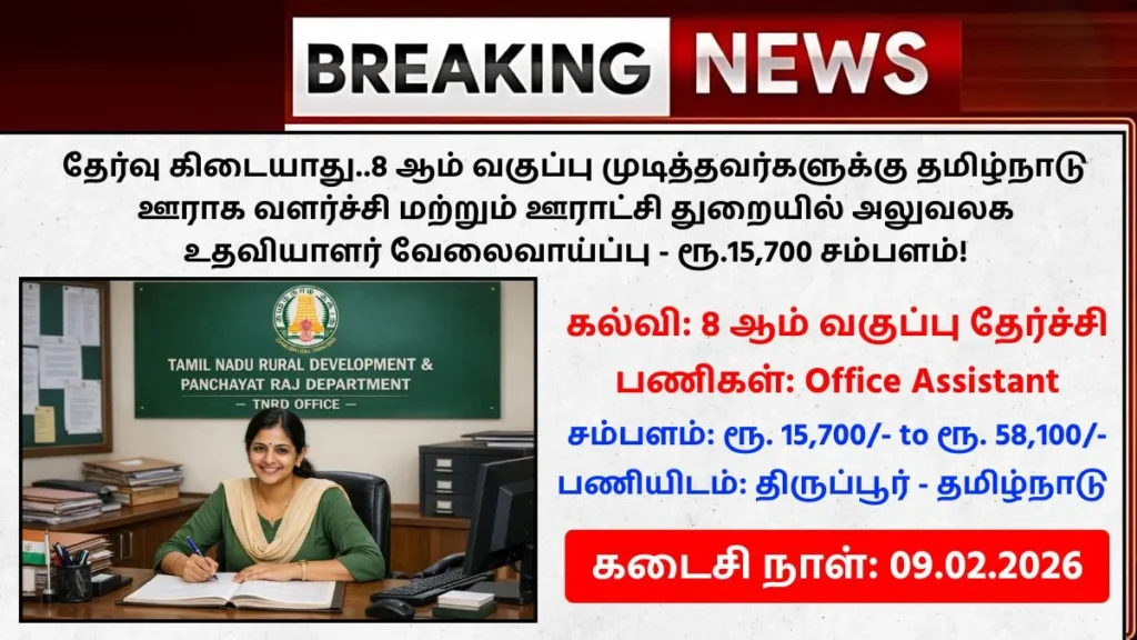 TNRD Office Assistant Recruitment 2026: தமிழ்நாடு அரசு ஊரக வளர்ச்சி மற்றும் ஊராட்சித் துறையின் (TNRD) கீழ் இயங்கும் திருப்பூர் மாவட்டம், தாராபுரம் ஊராட்சி ஒன்றியத்தில் காலியாக உள்ள 01 அலுவலக உதவியாளர் (Office Assistant) பணியிடத்தை நிரப்புவதற்கான புதிய அறிவிப்பு வெளியாகியுள்ளது. ஆர்வமுள்ள விண்ணப்பதாரர்கள் 09.02.2026 அல்லது அதற்கு முன் விண்ணப்பிக்க வேண்டும்.இந்த பணியிடங்களுக்கு யார் விண்ணப்பிக்கலாம்? கல்வித் தகுதி என்ன? வயது வரம்பு எவ்வளவு? விண்ணப்பிப்பது எப்படி? என்பதற்கான முழு விவரங்களையும் இங்கு பார்க்கலாம்.
